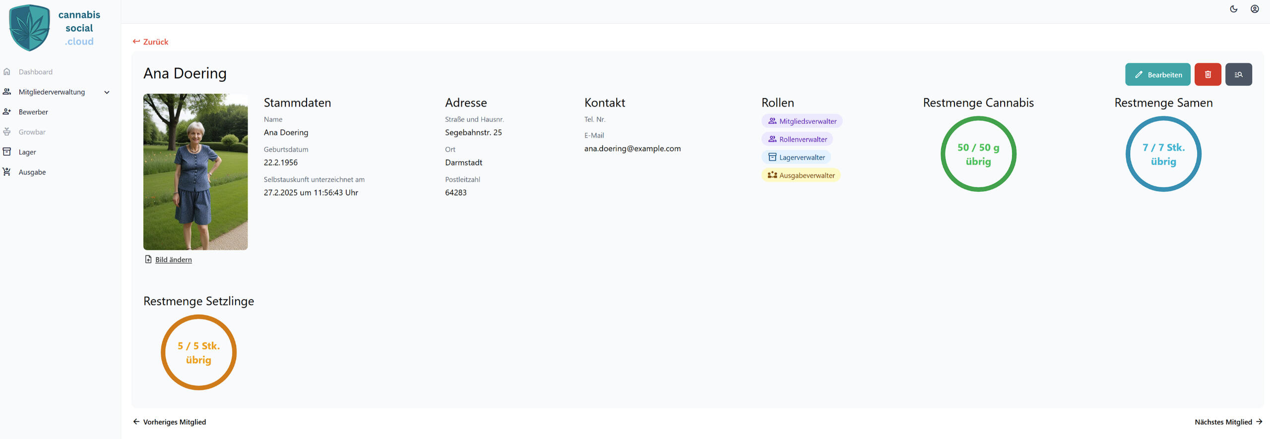 Filtere Mitglieder nach Status, Abgabemengen oder Beitrittsdatum. Sieh Restkontingente auf einen Blick und verwalte detaillierte Profile inkl. Historie.